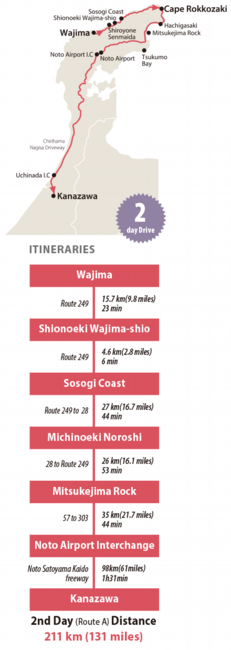 Although nearby Tsukumo Bay (九十九湾) with its beautifully indented coastline is worth visiting, it’s time to return to Kanazawa. Head west for about 35 kilometers (22 miles) on 57 to the Noto Airport (能登空港), and then hop onto Noto Satoyama Kaido at Noto Airport Interchange on the west of the airport and head toward Kanazawa.